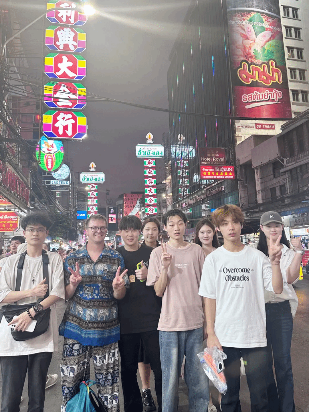 唐人街仿若时空交错的纽带,中式牌坊与泰式风情交相辉映,熟悉的乡音与异国的香料味相融,这里见证着文化交流的繁荣盛景;火车头夜市则是人间烟火的极致演绎,从垂涎欲滴的芒果糯米饭,到酸辣劲道的冬阴功汤,舌尖上的泰国开启味蕾狂欢,同学们在品尝美食中感受民众生活的温度与民俗风情的质朴。夜游湄南河,微风拂面,沿岸灯火辉煌,寺庙、宫殿、民居错落有致,河水倒映着历史与现代交织的画面,那一刻,对泰国文化包容万象的特质有了铭心领悟。