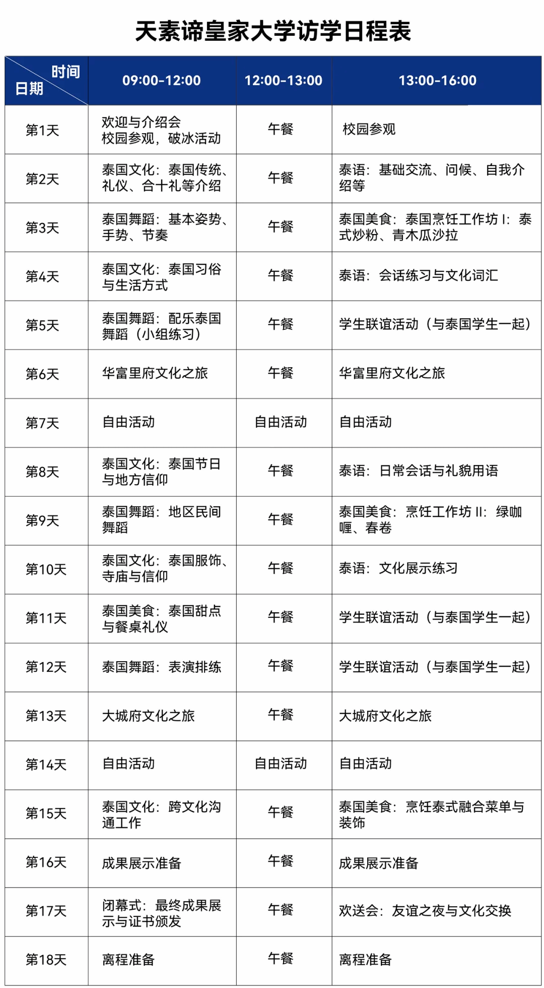 专业课、泰语、文化、舞蹈、美食等体验与学习。