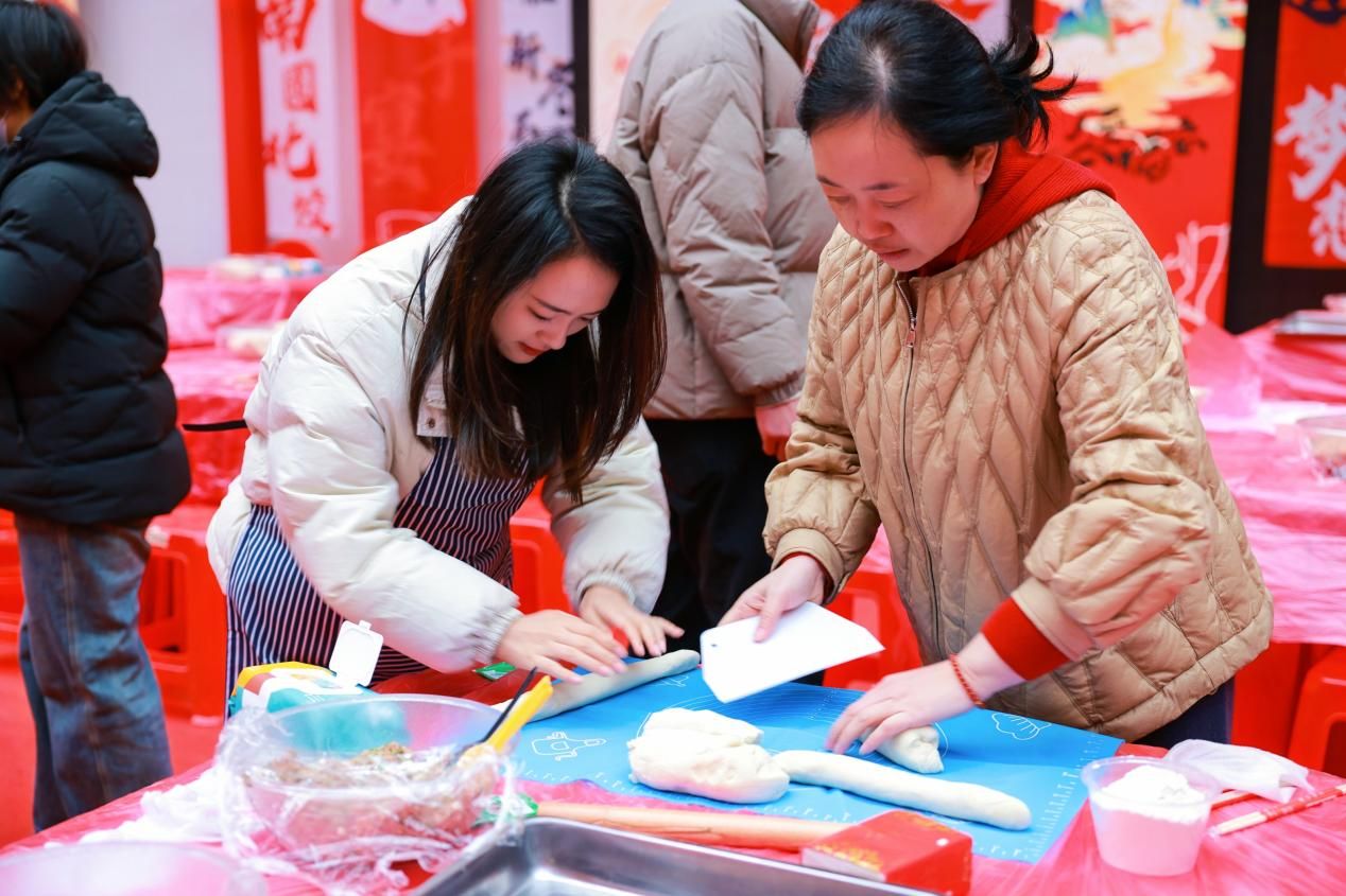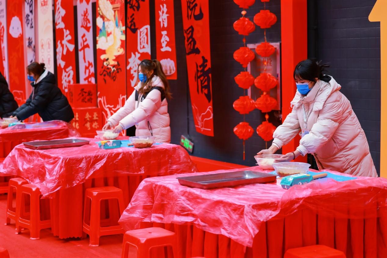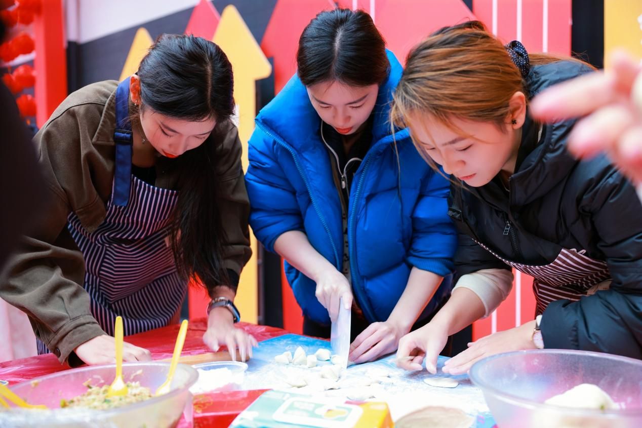 包饺子活动会场,节日的氛围在城院角落弥漫。灯笼高挂,如同串串喜庆的果实,照亮着每一份喜悦与期待。红色桌布铺就的桌椅,饺子皮、馅料与调料齐聚,欢声笑语中包裹着家的味道。