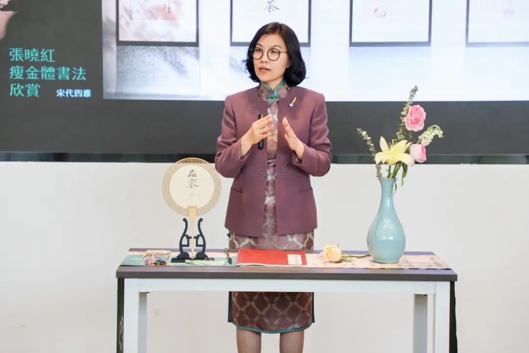 讲座伊始,张晓红以宋徽宗赵佶的《秾芳诗帖》、《瑞鹤图题诗》等传世作品为例,深入剖析了瘦金体“铁画银钩、飘逸峻拔”的独特美学。她指出,瘦金体虽以瘦劲见长,但“形瘦而神丰”,其笔法中的顿挫提按、章法中的疏密节奏,无不体现宋代文人“格物致知”的哲学思想,引得现场师生连连赞叹。