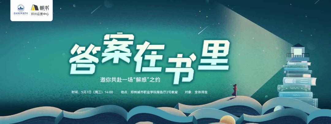 现在,有一场关于解答以上答案的线下交流分享会,诚邀你的加入。5月7日(周三)14:00,樊登读书会将首次走进郑州城市职业学院,我们相约学校报告厅2号教室,以“答案在书里”为名与你共同解锁8本人生解忧书单,用思想碰撞的火花,照亮困惑中的暗角,现场席位仅150个,先到先得!