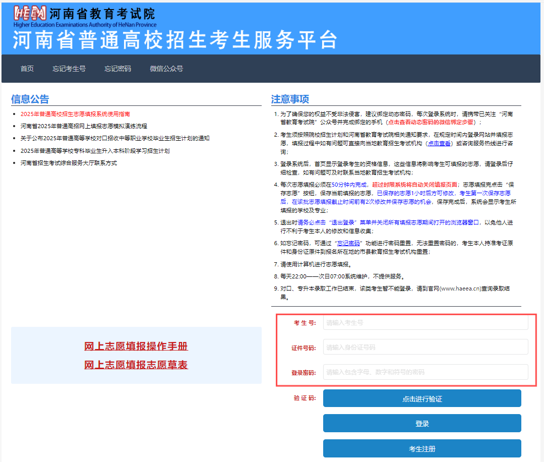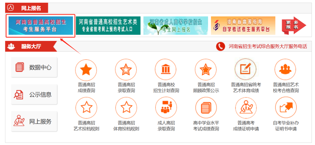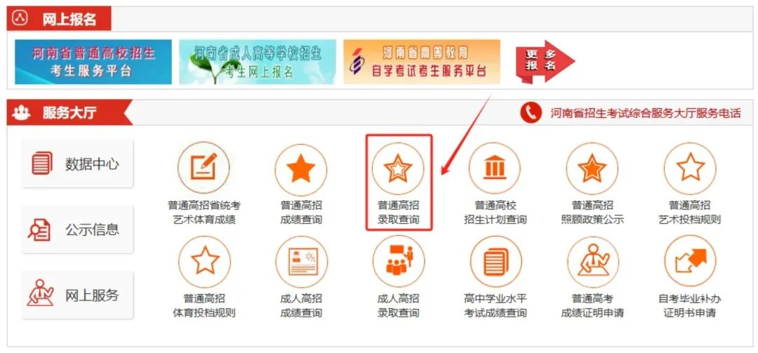进入“河南省教育考试院网站(http://www.haeea.cn/)”,点击“河南省普通高校招生考生服务平台”进行查询。