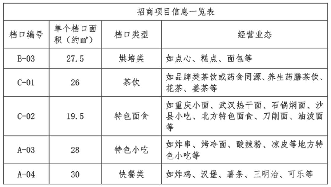 项目概况:拾光餐厅建筑面积1748㎡,本次公开招商档口共计5个,档口面积及品类参照信息如下。