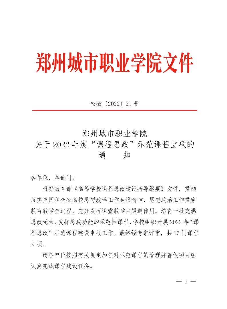 校教〔2022〕21号 关于2022年度“课程思政”示范课程立项的通知