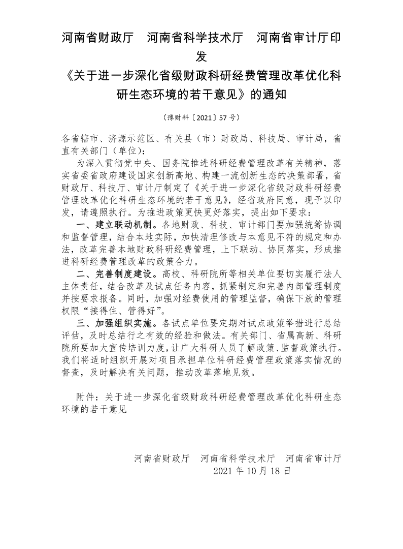 关于进一步深化省级财政科研经费管理改革(豫财科〔2021〕57号)
