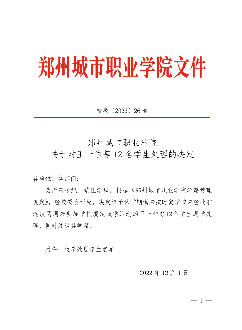 校教〔2022〕26号 关于对王一佳等12名学生处理的决定