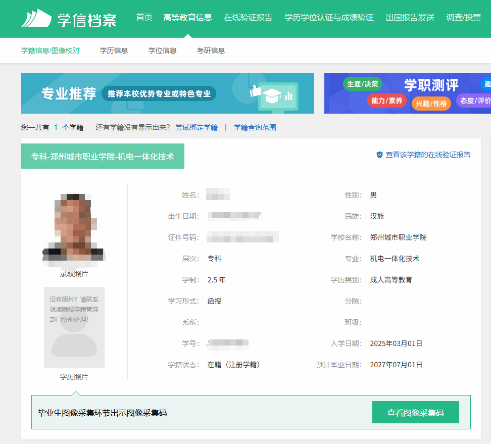 5.点击“高等教育信息”,核对本人信息是否有误。(注意:应仔细查看姓名、性别、年龄、身份证号码、学校、专业等信息是否有误,可及时申请更改。毕业之后很难更改,毕业时也需要核对各项个人信息)。