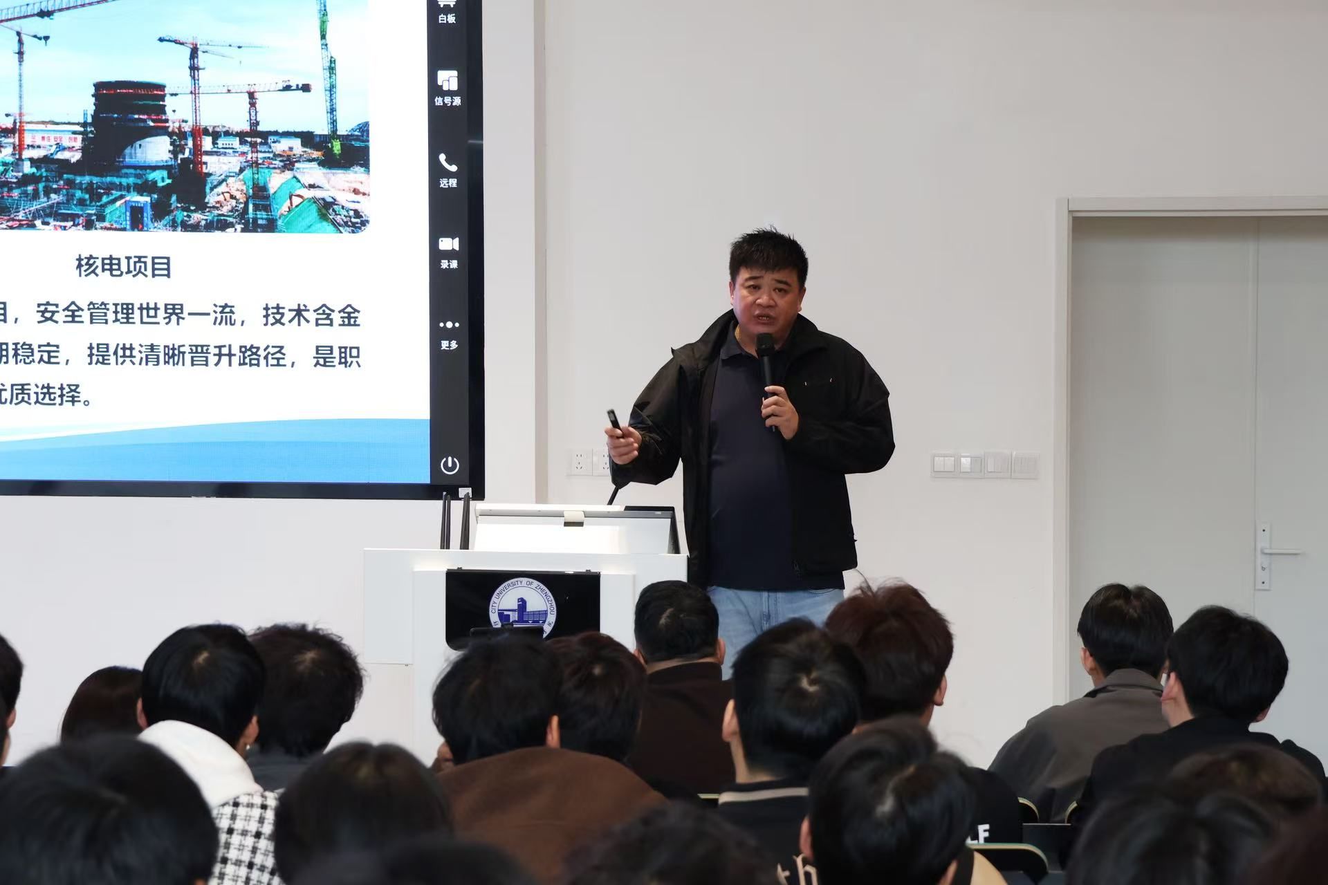 针对建筑类专业的职业适配性,姜大明重点解读了工程建设、调试运维两大板块。土建施工、设备安装作为核电工程建设的核心环节,对建筑类、机电类专业技能人才需求旺盛。他强调:“一线岗位并非‘搬砖’,而是掌握核心技术的关键岗位,更是晋升管理层的必经之路。”这番话语为同学们描绘出一条从基层技术岗位走向管理岗位的清晰成长路径。