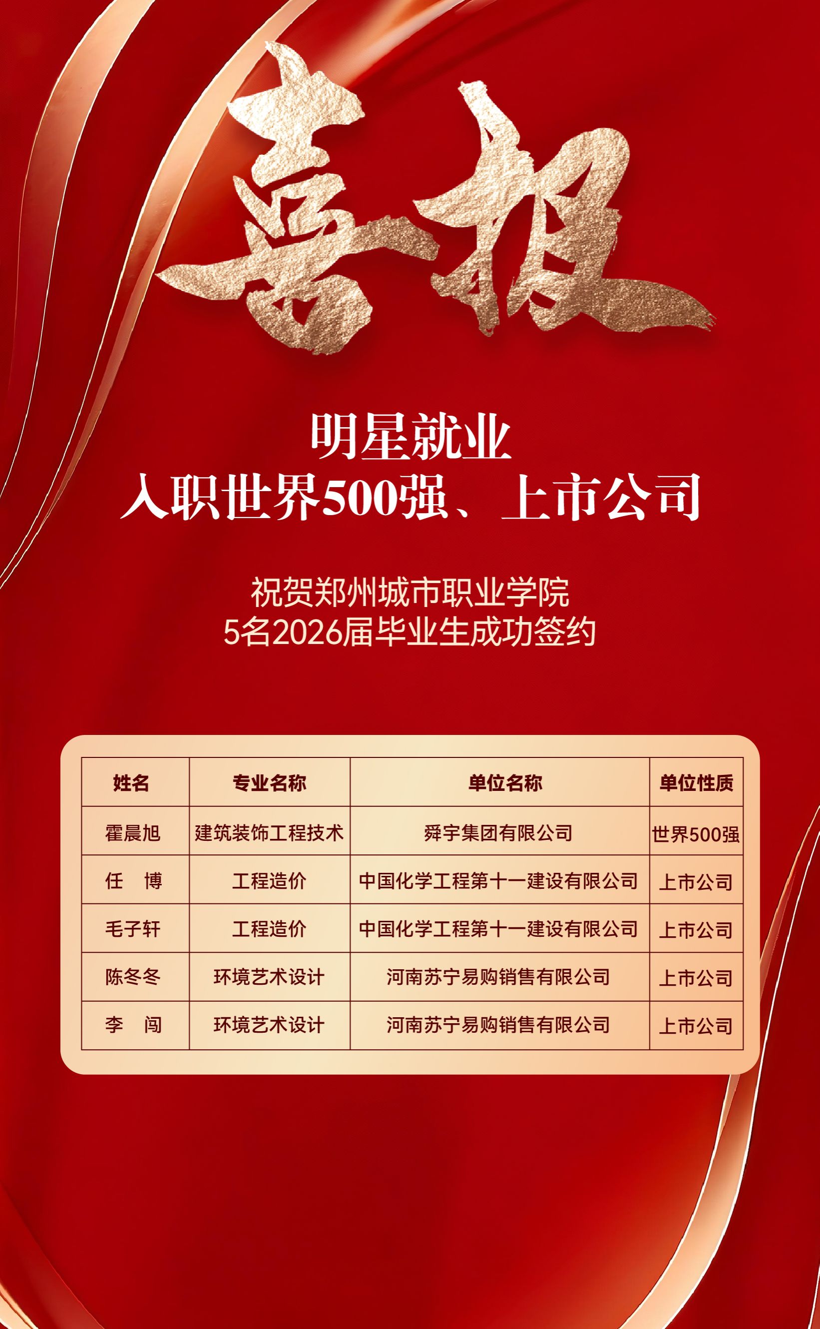 近日,我校就业工作再传捷报,新材料与智慧人居学院5名2026届毕业生凭借扎实的专业能力与综合素养,成功签约舜宇集团有限公司(世界 500 强)、中国化学工程第十一建设有限公司、河南苏宁易购销售有限公司(上市公司),彰显了学院人才培养与就业服务的扎实成效。