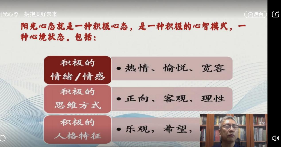 本期讲座内容丰富,主题鲜明突出,葛教授以“塑造阳光心态,拥抱美好未来”为题,围绕心态对行为的影响、用阳光心态调适新冠疫情下的自我、疫情下阳光心态调节技术三个方面进行深入阐述。