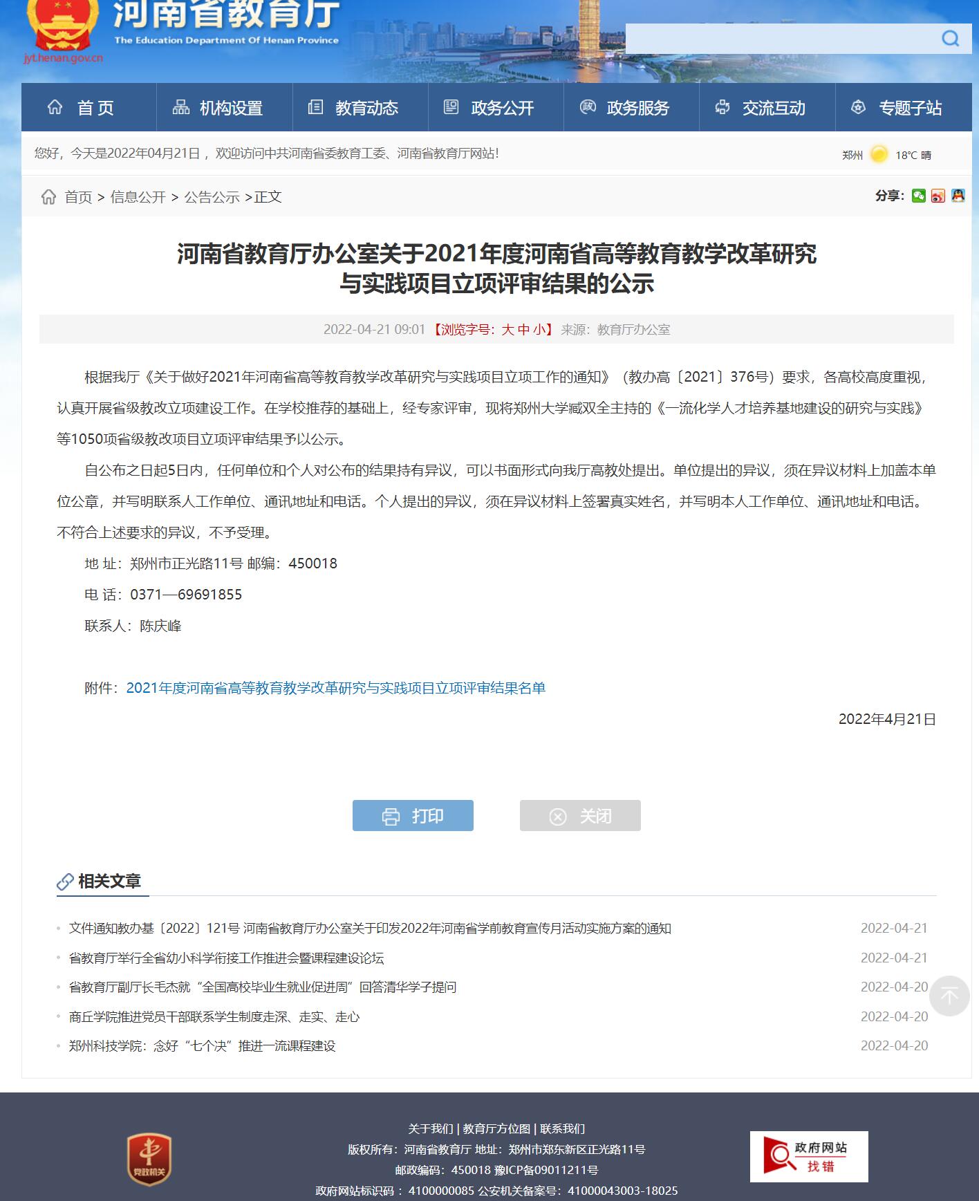 根据教育厅《关于做好2021年河南省高等教育教学改革研究与实践项目立项工作的通知》(教办高〔2021〕376号)文件要求,郑州学校教务处认真组织,各二级学院积极配合,圆满完成了本次省级教改立项的申报工作。