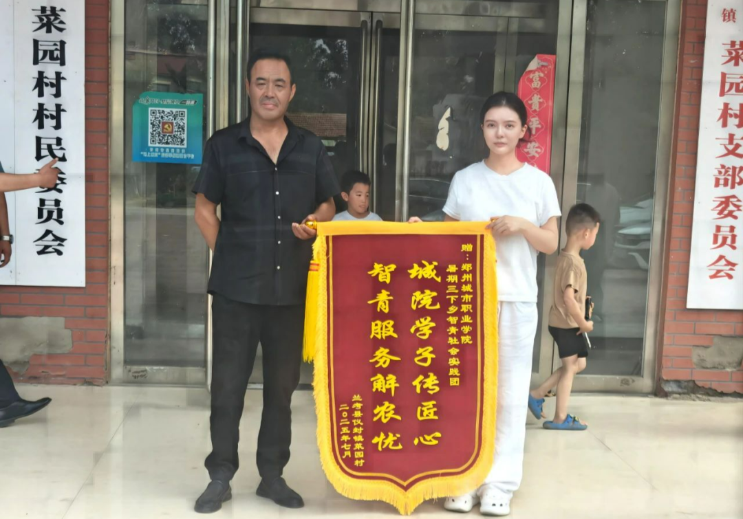 活动收官之际,村民们特意将一面印有“城院学子传匠心,智青服务解农忧”的锦旗郑重赠予实践团指导老师。接过锦旗的学子们脸上洋溢着自豪与感动,这面锦旗不仅是对他们实践成果的充分肯定,更是一份信任与激励。