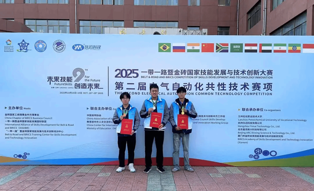 近日,一带一路暨金砖国家技能发展与技术创新大赛-电气自动化共性技术赛项全国总决赛在甘肃兰州石化职业技术大学盛大举办。郑州城市职业学院在该项赛事获国家级奖项3项,2024级机电一体化技术专业学生刘铭威荣获一等奖,张俊鹏荣获三等奖,教师申伟鹏荣获二等奖;同时,申伟鹏老师获“优秀指导教师”,学校获“最佳组织奖”。