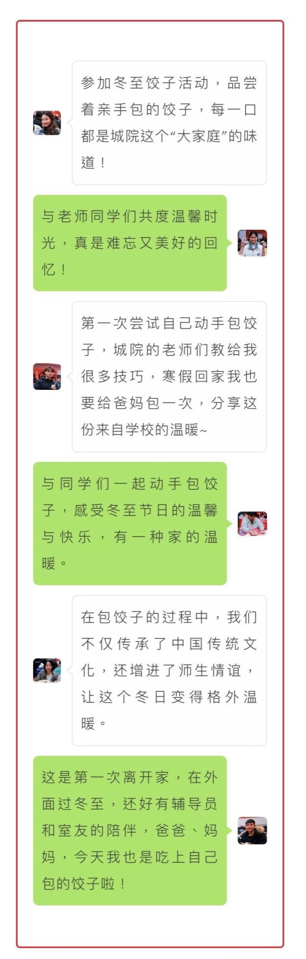 “最以学生为中心”一直是城院的核心教育理念。在这个传统节日里,校领导们走进学生和老师们中间,擀制面皮、精心包制饺子。在轻松愉快的氛围中,与大家畅谈生活、学习,分享彼此的感悟与期待,用实际行动诠释了教育工作者关怀与陪伴的真谛。让师生们感受到来自学校的温暖与力量,这个冬至,因爱而温暖,因陪伴而美好!