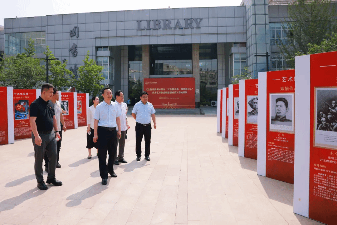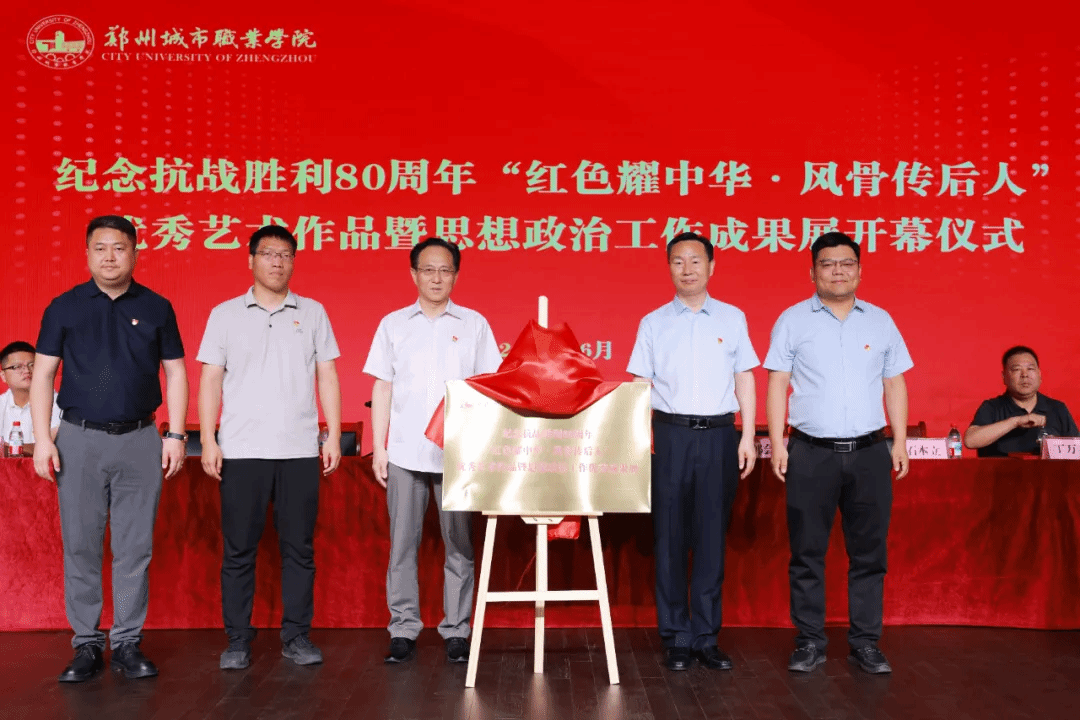 贾战峰、郭会强、王永康、刘昆岭、刘尚林共同为郑州城市职业学院纪念抗战胜利80周年“红色耀中华·风骨传后人”优秀艺术作品暨思想政治工作成果展揭牌并参观了展览。