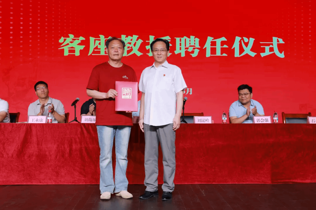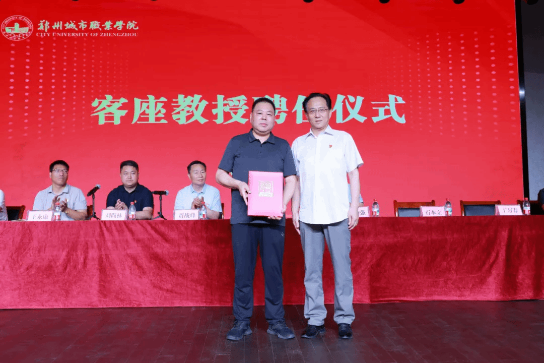 郑州城市职业学院党委书记刘昆岭为丁万春主席颁发客座教授聘任证书