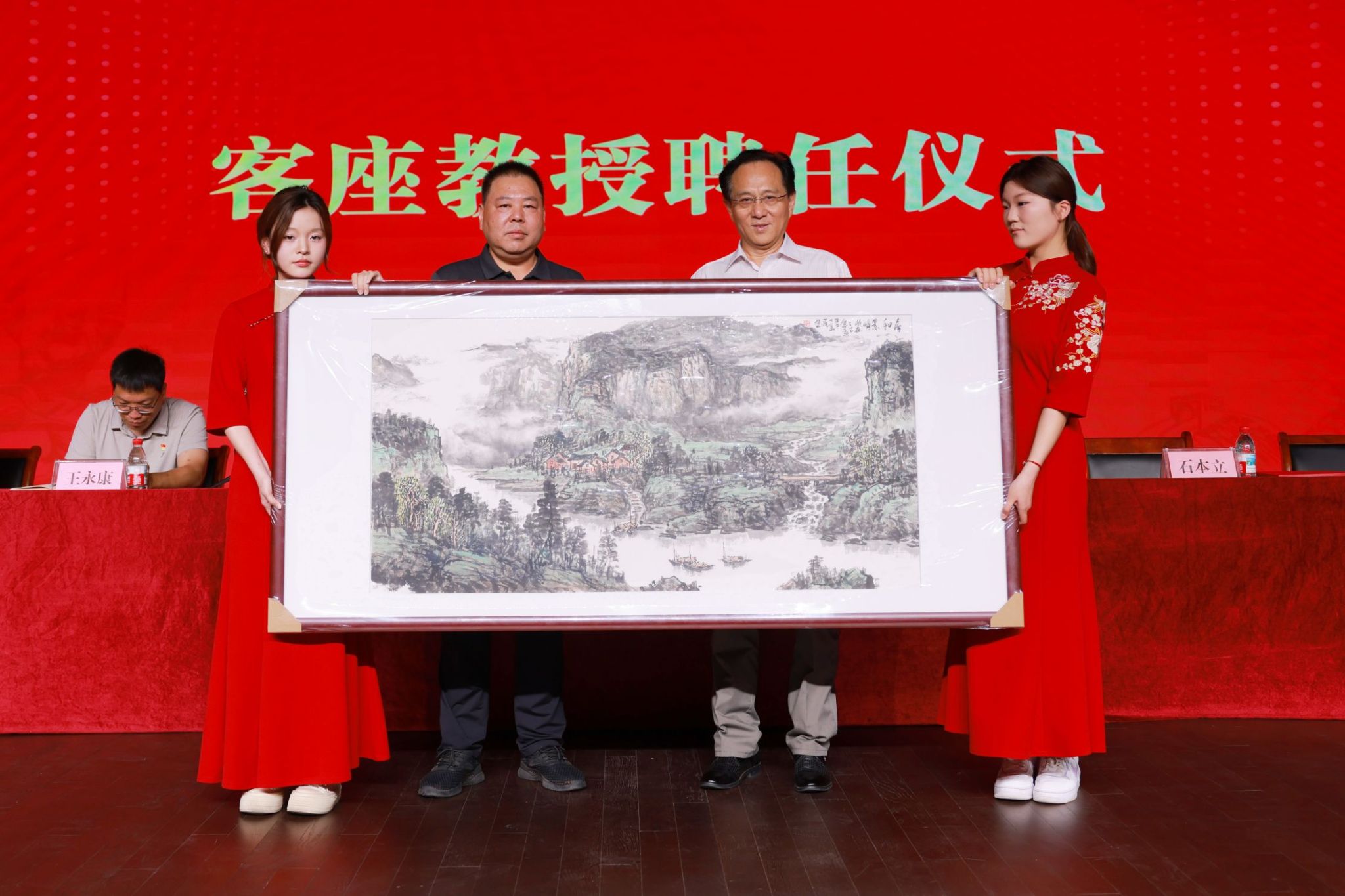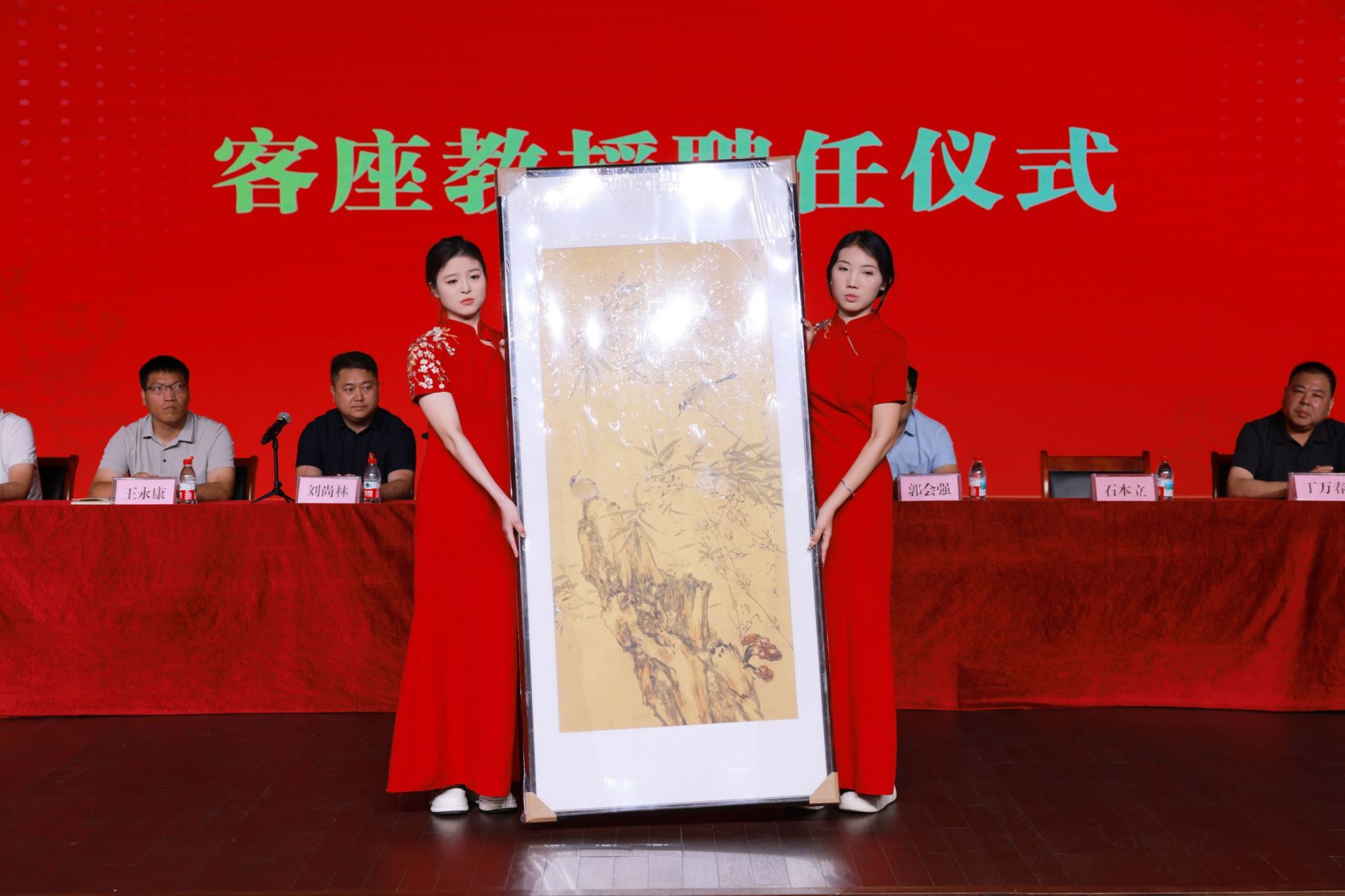 石本立在主持时表示,“大学之大,不在于楼宇之大,而在于大师之大;大学之兴,不系于设备之新,而系于大师之兴。”一所大学的根本价值与永恒魅力,源自其汇聚的学识渊博、思想深邃、人格高尚的大师。为进一步充盈师资队伍,培养复合型人才,学校聘任河南省美术家协会副主席连俊洲、郑州市美术家协会副主席丁万春、新密市书法家协会主席高克勤为学校客座教授。连俊洲主席线上对获奖同学表示祝贺,对郑州城市职业学院的发展表示关心和祝福,并向城院捐赠《登临极目花鸟画》,丁万春主席、高克勤主席分别现场为学校赠送了《春和景明山水画》《毛泽东咏梅词》。