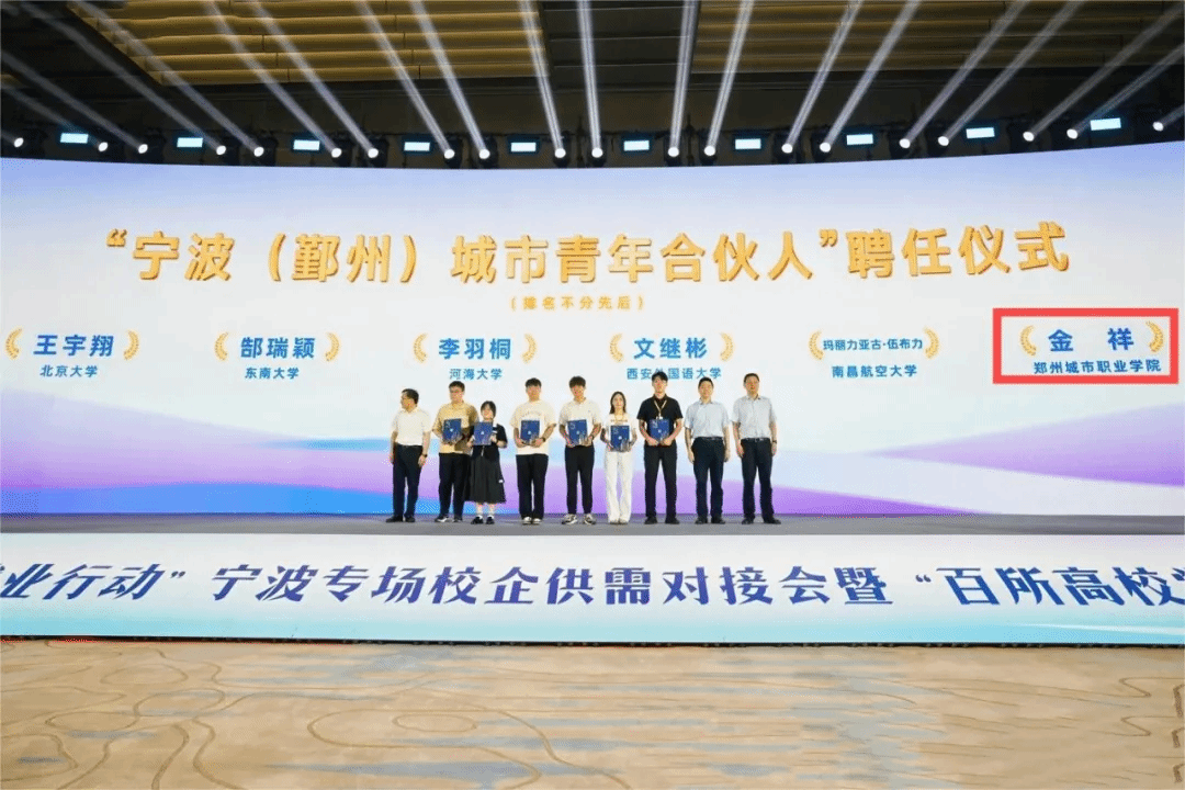 郑州城市职业学院由副校长丁雅荣带队,师生代表一行5人受邀参会。活动中,学校优秀学生金祥凭借扎实的专业素养和出色的综合能力,与北京大学、东南大学等高校学子共同获聘“宁波(鄞州)城市青年合伙人”,彰显了城院在人才培养质量上的显著成效。