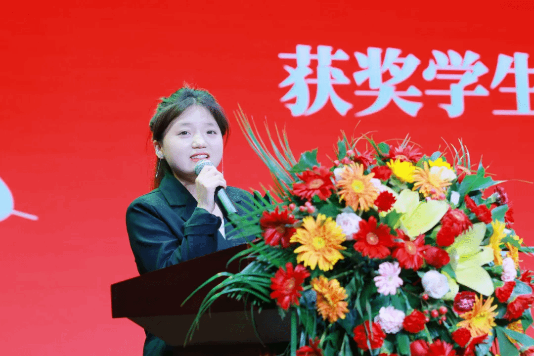 获奖学生代表文化教育学院刘思雨同学在发言中感谢老师的悉心指导和学校的实践平台让她找到了方向,分享了自己在学业上勤奋努力、实践中的锻炼成长以及技能比赛的赛后心得,她始终相信“方法大于努力”,赛后必做三件事——复盘、总结、提炼。未来,她将以更高标准要求自己,向省级、国家级赛事发起冲击!激励着其他学生对标先进的决心。