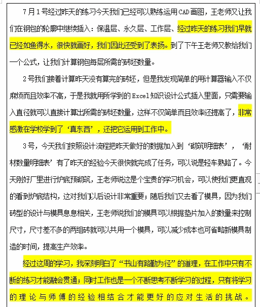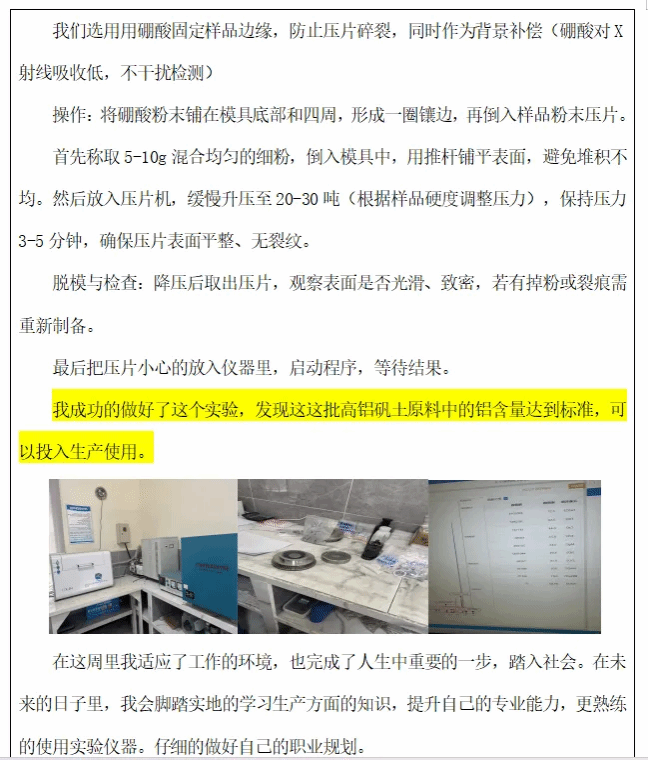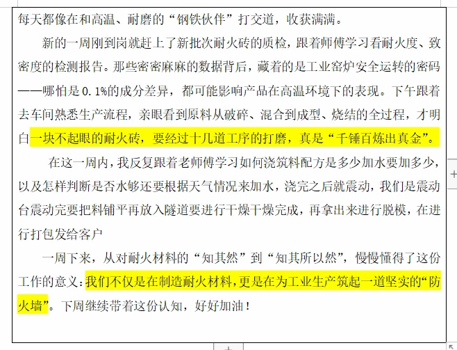 “细节决定成败,数据必须精确。”2023级材料工程技术专业杜康豪同学在实习周记中记录下企业领导对其工作态度的赞赏。从记录透气砖工艺到主动参与车间实操,他深切体会到:“投入实干才有真收获。”担任设计师助理的2023级材料工程技术专业楚团结同学则在日志中感慨:“感谢老师让我扛起‘耐火材料’这面大旗。命运把我带到鲁东,我必不负使命。”