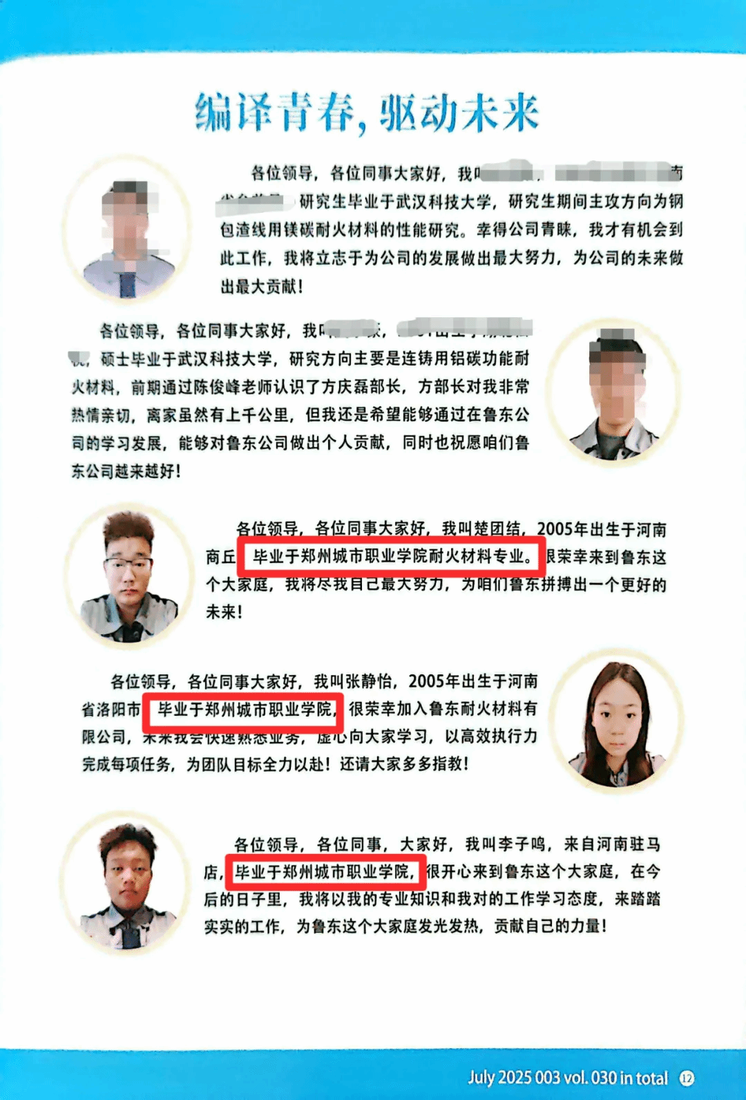 从高薪抢人的灼热现场到投身名企的专业实践,郑州城市职业学院耐火材料专业以“双中心”理念(以学生学习收获为中心、以专业对口就业为中心),架起产教融合的坚实桥梁。当学生在实习日志中写下“扛起行业大旗”的誓言,当企业为一张张年轻面孔开出优厚待遇,这场企业与学子的双向奔赴,正为中国耐材行业锻造着生生不息的新生力量。