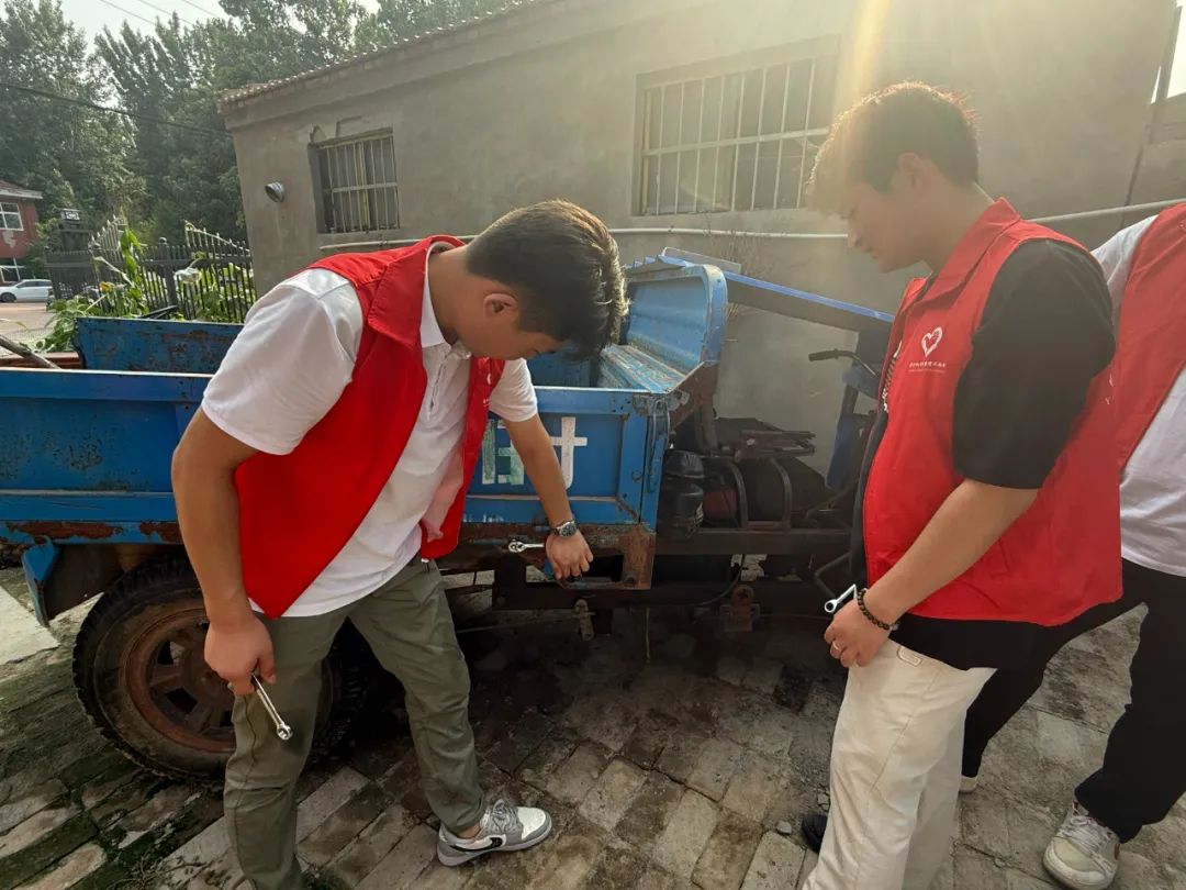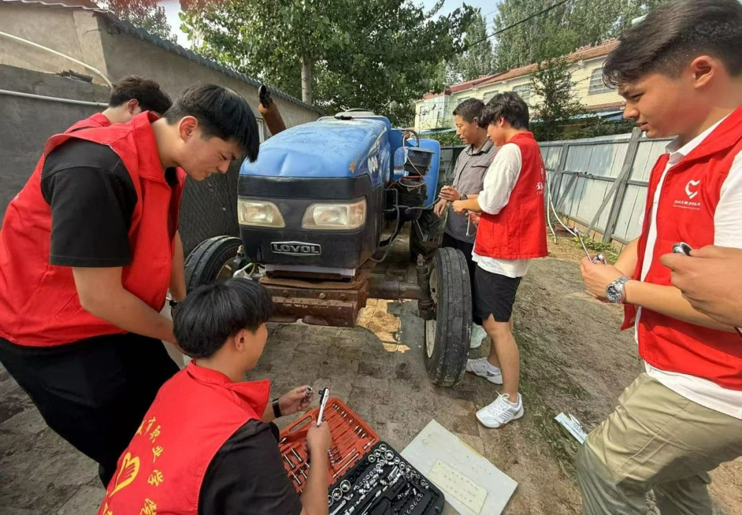 抵达菜园村后,实践团成员迅速深入农户家中与田间地头,化身农机“医生”,针对困扰村民的各类农机“疑难杂症”展开精准排查与维修。面对拖拉机发动机启动困难、收割机割台升降异常等复杂故障,学生们凭借扎实的理论功底和实操技能,严谨检测,精准定位故障根源,让在课堂所学的理论知识落地。