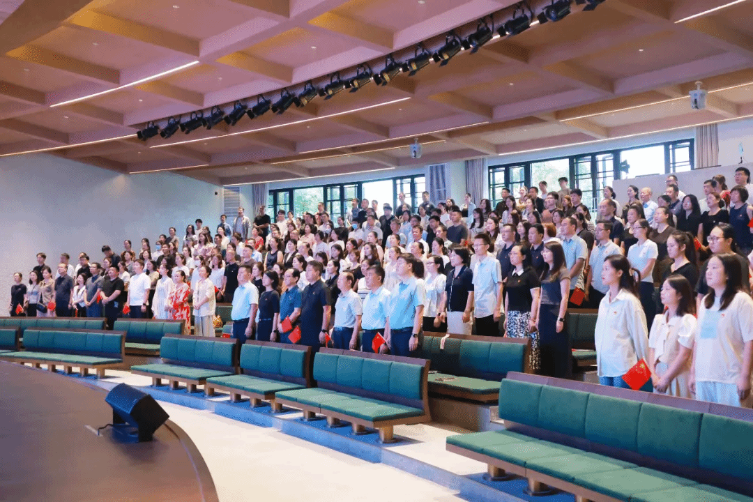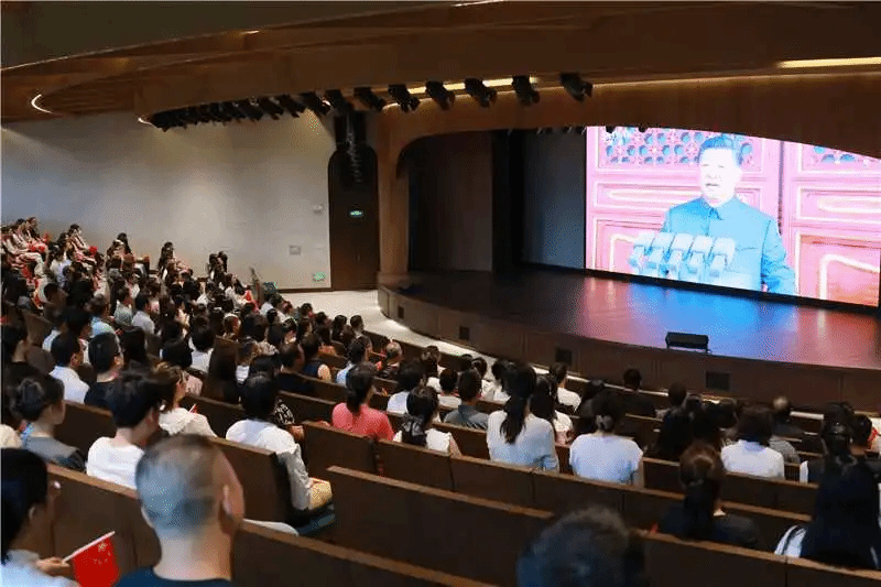 ▲全体教职工在报告厅二楼收看阅兵盛典