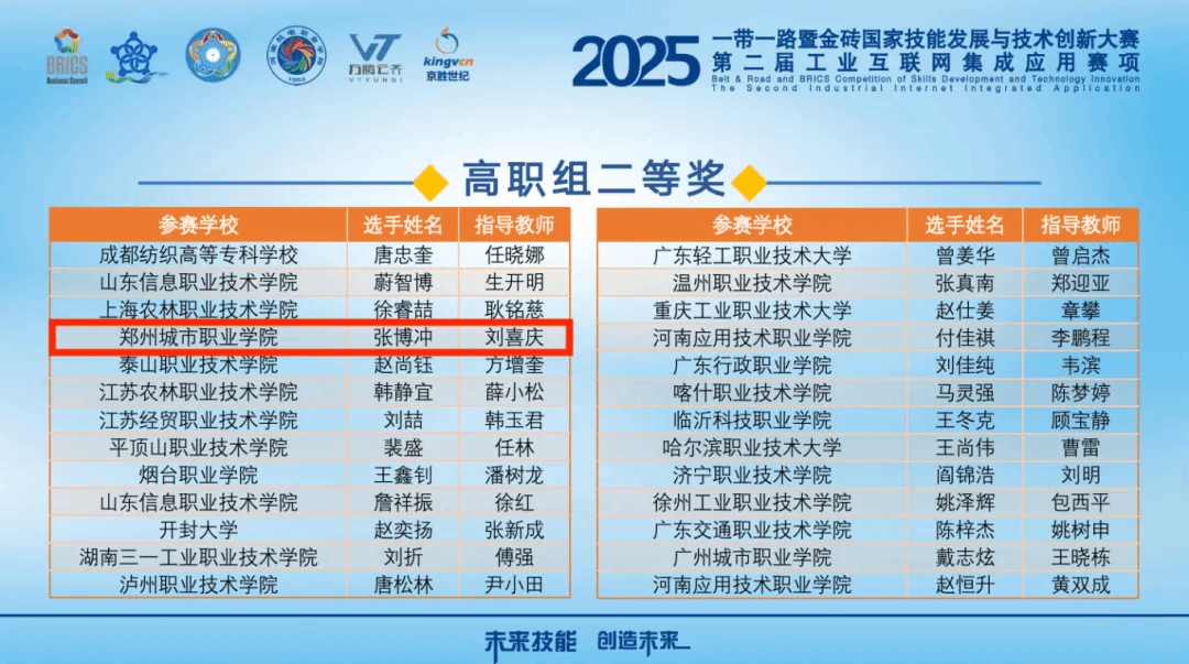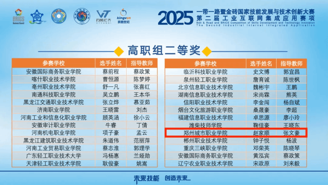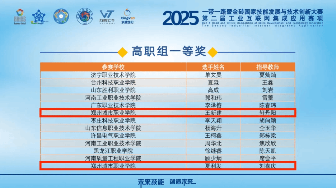 近日,“一带一路”暨金砖国家技能发展与技术创新大赛——工业互联网集成应用赛项全国总决赛传来捷报。郑州城市职业学院在该项赛事获国家级奖项共4项,其中一等奖2项,国赛二等奖2项,同时,学校获“最佳组织奖”。2024级电气自动化技术专业学生夏利发、工业机器人技术专业学生王新建凭借扎实技能与出色发挥,从全国近千名选手中脱颖而出,分别荣获全国一等奖;电气自动化技术专业学生张博冲、赵家顺分别获全国二等奖。