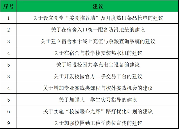 活动前夕,学校通过数智城院、校园电子屏面向全体学生公开征集建议,短短三天便收到115名同学的建言献策。经学校细致筛选,最终凝练出涵盖“吃住行学管团”六大维度的13项建设性提议。