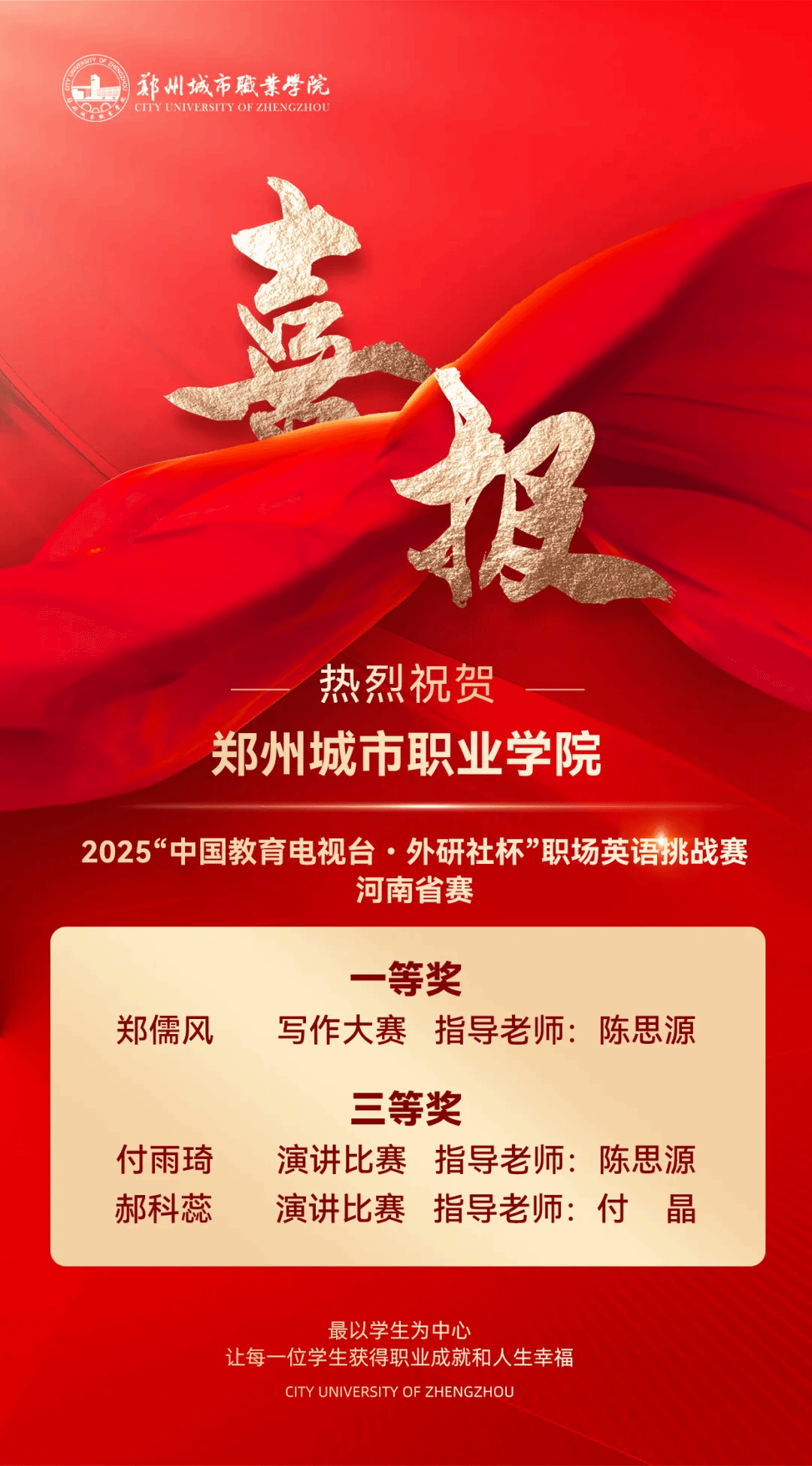 近日,“中国教育电视台・外研社杯”职场英语挑战赛河南省赛在南阳顺利举行。来自全省44所高职院校的126名选手齐聚一堂,围绕职场英语综合能力展开激烈角逐。在这场知识与技能的较量中,郑州城市职业学院学子以扎实的英语基础与出色的职场素养斩获奖项,在省级赛场展现了专业风采,为学校赢得荣光。
