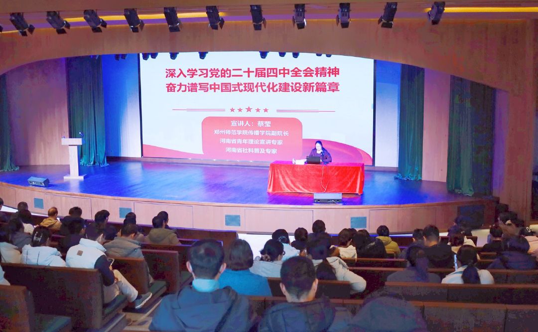 12月17日下午,郑州城市职业学院全体教职员工在报告厅二楼集体学习党的二十届四中全会精神。会议邀请河南省青年理论宣讲专家、郑州市委宣讲团成员、郑州师范学院传播学院副院长蔡莹博士作宣讲报告。学校领导和全体教职员工共同参加报告会,报告会由党委书记刘昆岭主持。