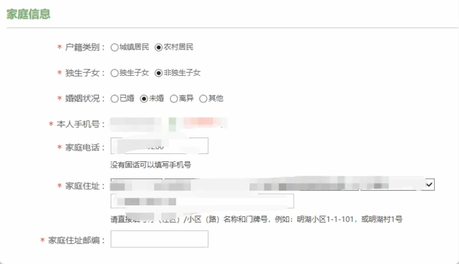 ⑤家庭住址及邮编:按实际选定省、市、县区,再填写具体住址,及邮编。