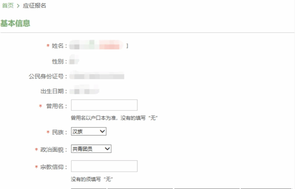 ③政治面貌:群众、中共党员、共青团员、其他党派成员,如实选定。(政治面貌一栏没有“预备党员”这个选项,如果是预备党员可先填写“中共党员”,后期咨询武装部看是否需要修改。)