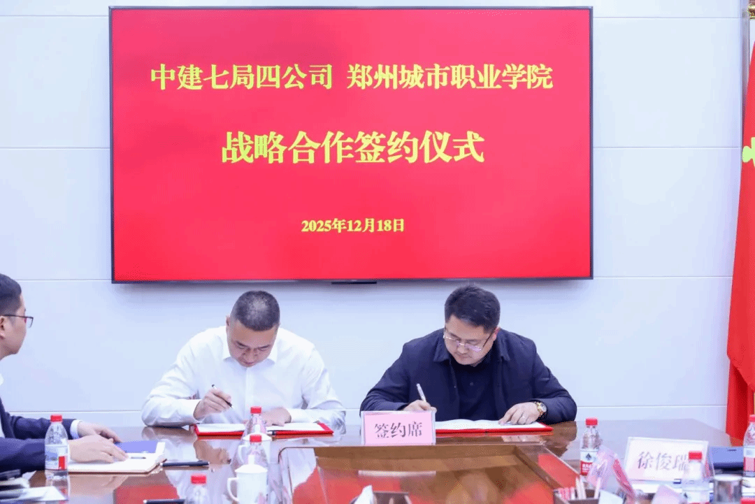 12月18日,郑州城市职业学院与中建七局第四建筑工程有限公司战略合作签约仪式在郑州城市职业学院隆重举行。中建七局四公司副总经理刘帅等企方领导,党委委员、副理事长刘尚林,郑州城市职业学院党委委员、校长石本立等校方领导与相关部门负责人出席仪式,共同见证这一深化产教融合的重要时刻。