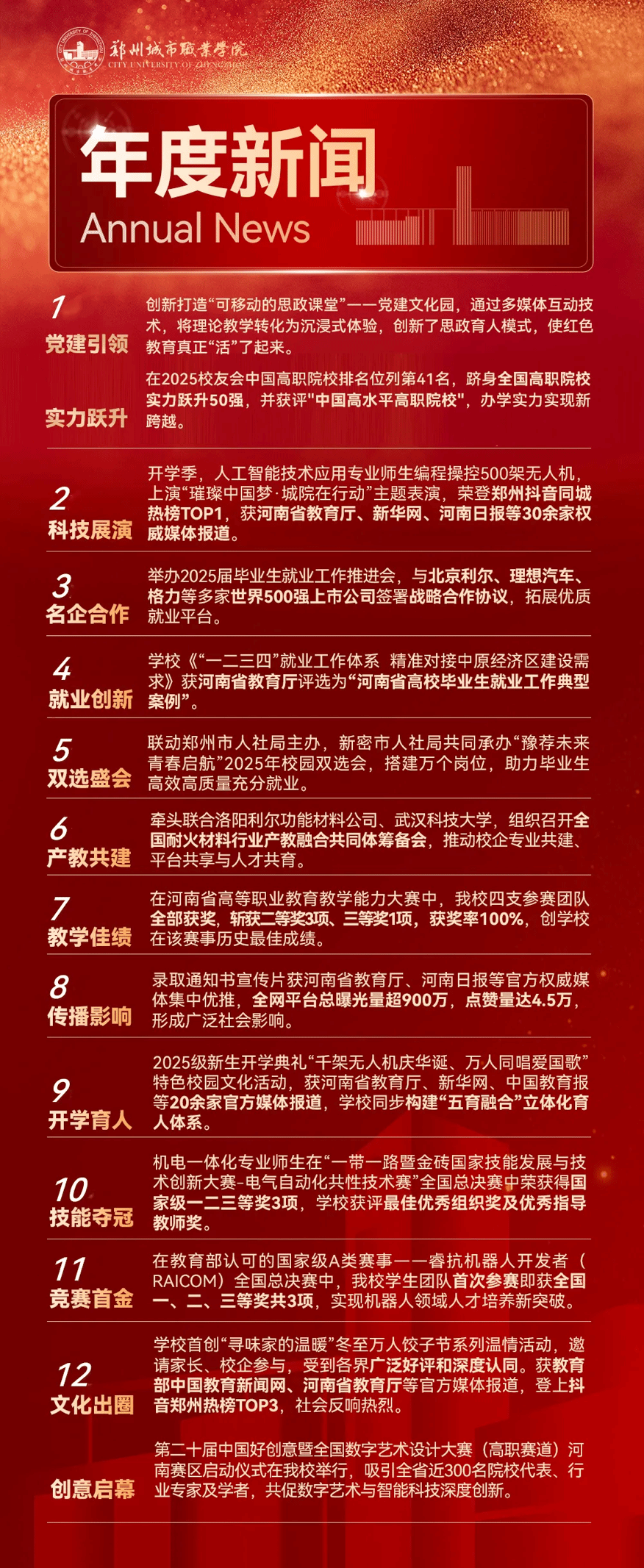 韶光似箭,岁序更替。郑州城市职业学院2025年创造了无数心潮澎湃、难以忘怀的瞬间,让我们携手回望这一年的温暖与荣光!