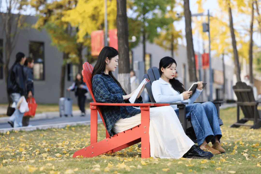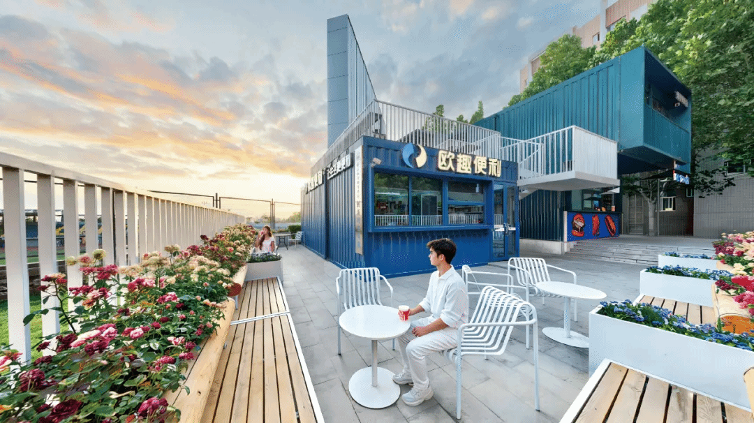 匠心园的石阶旁,绿草如茵,凉亭静立,彩色集装箱错落有致,实训教室分享创意,潮流与青春在这里进行碰撞。