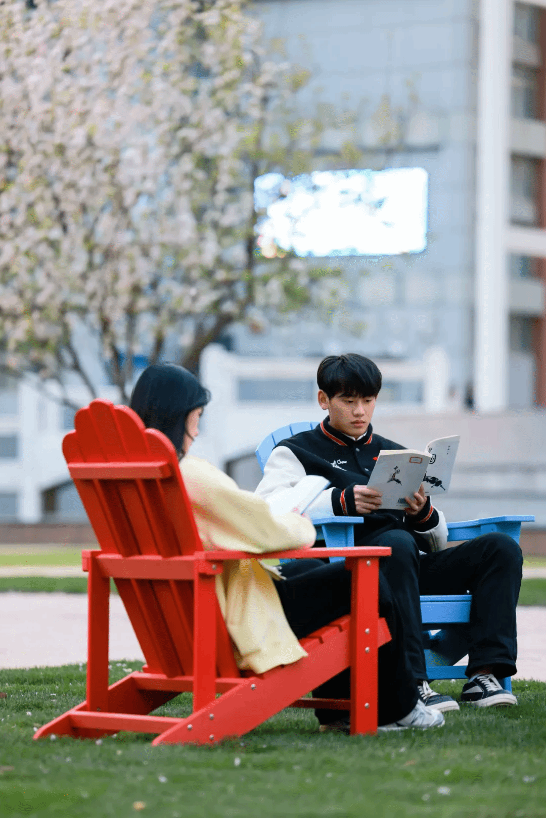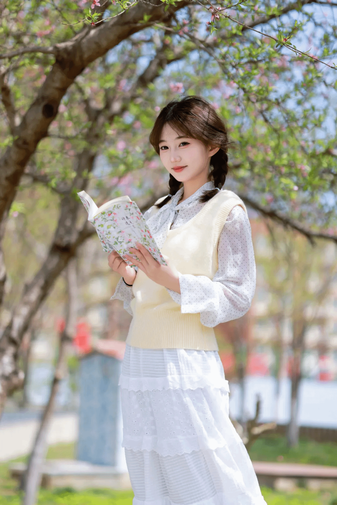 诗意场景,人与自然共生,初春的樱花小道,花瓣如雪,随风轻舞,树下有人读书、有人凝望。