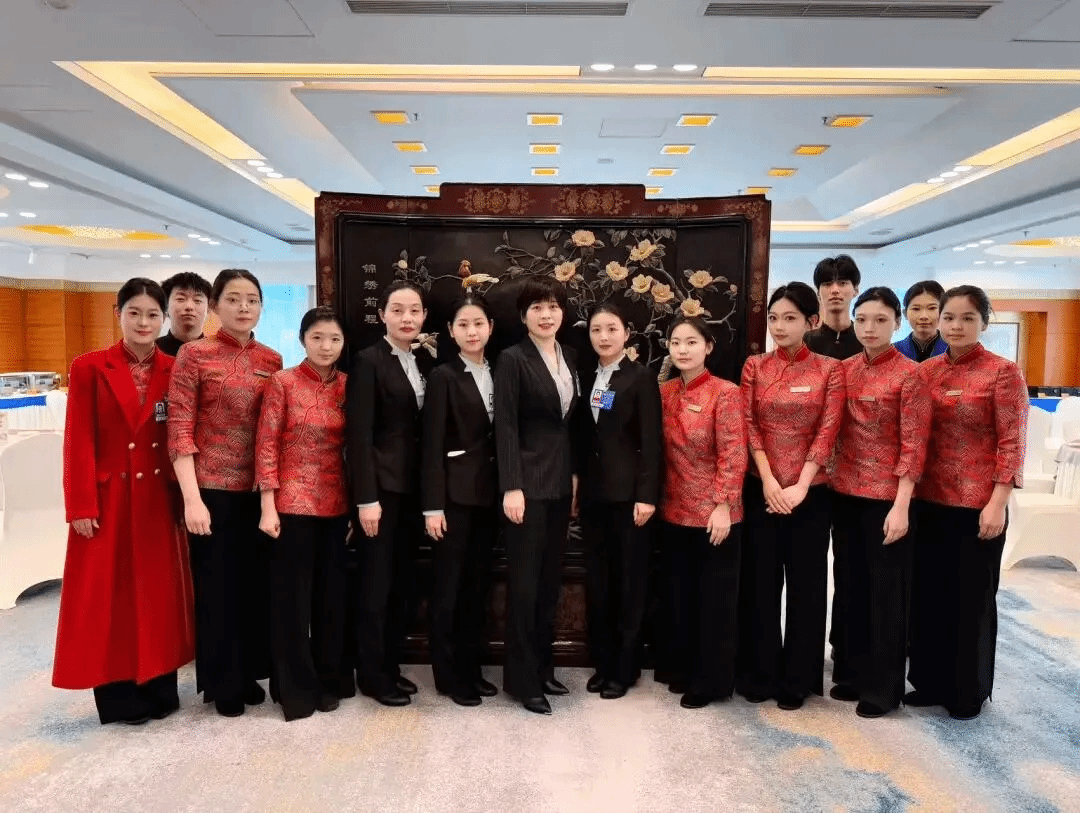 经过层层选拔,王子鹤等10名学子脱颖而出,于2月24日至3月13日投身实习一线,承担前台接待、会议服务、礼仪引导、VIP客房服务、餐饮服务等核心岗位。从课堂模拟到政务实战,从理论学习到岗位应用,同学们直面国家级服务场景的全方位检验,在每一次接待、每一项任务中淬炼专业硬功,展现出卓越的职业素养。