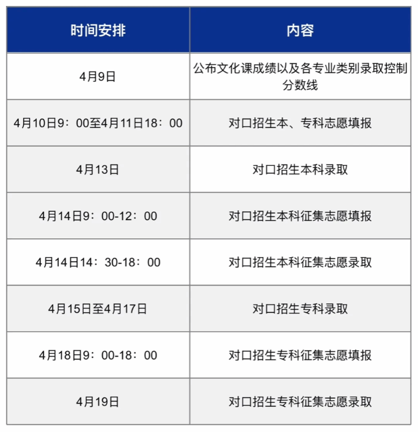 4月15日至4月19日进行对口招生专科录取。