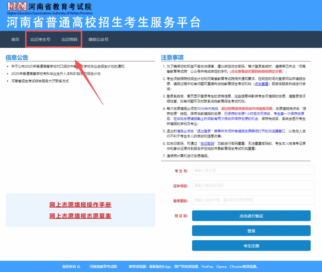进入考生服务平台后,请仔细阅读“信息公告”区、“注意事项”区发布的政策公告和注意事项。