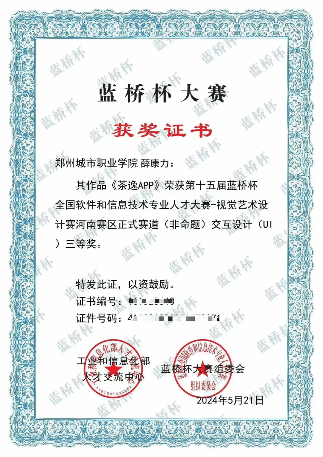 他曾在第十五届蓝桥杯全国软件和信息技术专业人才大赛中,一举斩获视频设计二等奖、交互设计(UI)三等奖及设计类优秀奖。2025年4月,在学校老师的鼓励和支持下,他报名参加全国大学生职业规划大赛,凭借清晰的职业规划与坚定的传承信念,一路层层突围挺进国赛,摘得国家级铜奖。