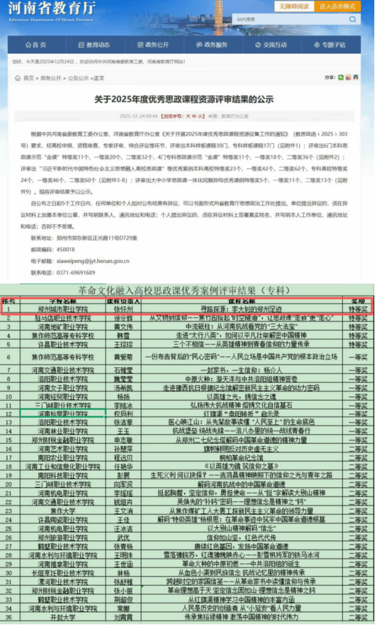 近日,中共河南省委教育工委办公室、河南省教育厅办公室依据《关于开展2025年度优秀思政课程资源征集工作的通知》(教思政函﹝2025﹞303号)要求,历经高校申报、资格审查、专家评审、综合评议等多轮严苛筛选,正式公示2025年度全省优秀思政课程资源评审结果。其中,郑州城市职业学院马克思主义学院张怀州老师报送的《寻路探源:李大钊的郑州足迹》,在革命文化融入高校思政课优秀案例评审中脱颖而出,不仅斩获专科组特等奖第一名,更成为全省5个特等奖中唯一来自民办职业院校的获奖案例,为学校思政教育事业书写下浓墨重彩的一笔。