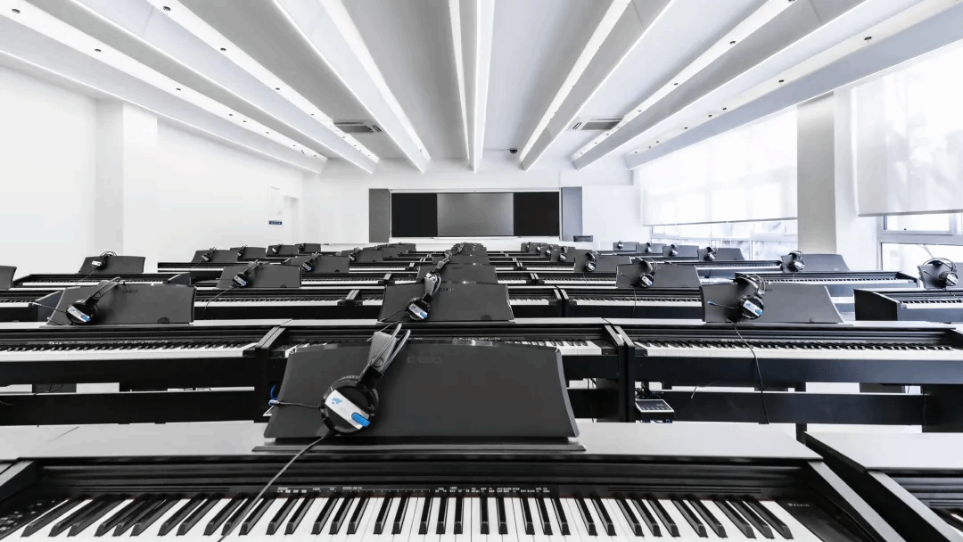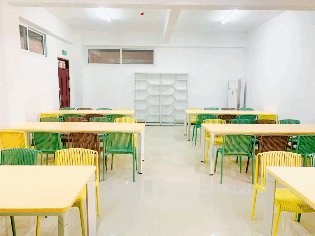 教室简洁色调搭配开阔的设计,营造出纯粹氛围感,宽敞排窗外流动风景,赋予学习空间自然、宁静的特质。