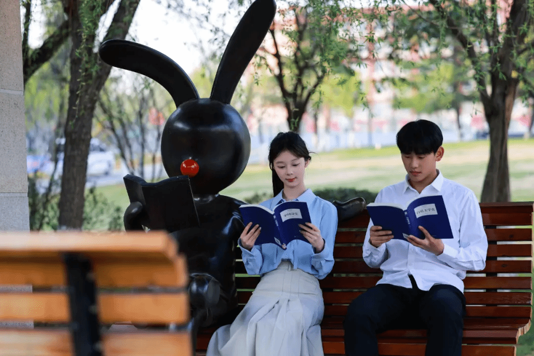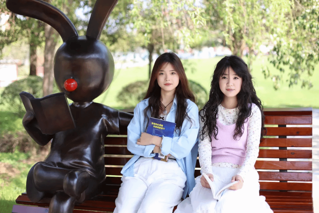 古朴凉亭静静伫立,长椅旁的兔子雕塑灵动可爱,陪伴城宝们感受校园的宁静美好,远处红旗广场,五星红旗猎猎飘扬,在微风中诉说着奋进的力量。