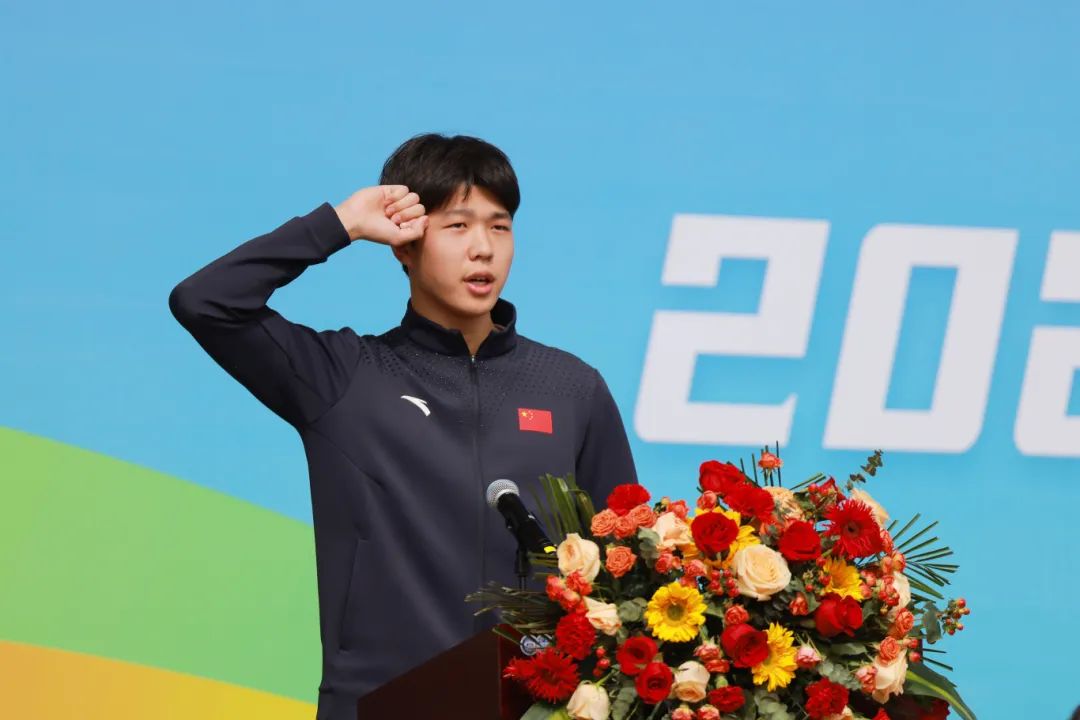 裁判员代表通识教育学院教师张佳翼庄严宣誓,承诺将严格遵守裁判规则,公正、公平地执行裁判工作,确保比赛的顺利进行。