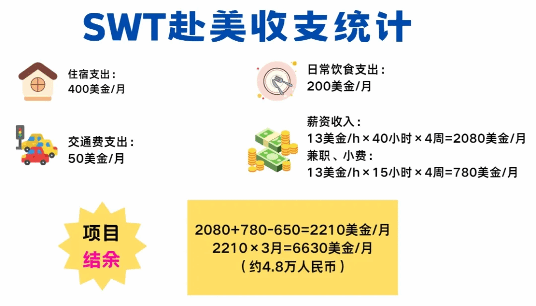 学生实习工作时间约为每周32-40小时;薪资为每小时10-18美金,每周或者每两周发一次工资,可根据自身能力和工作安排,寻找第二份工作,获得更高收入,用收入抵消项目前期花费,支撑在美日常消费,真正做到低成本旅游。收入可抵前期大部分开销,低成本赴美!