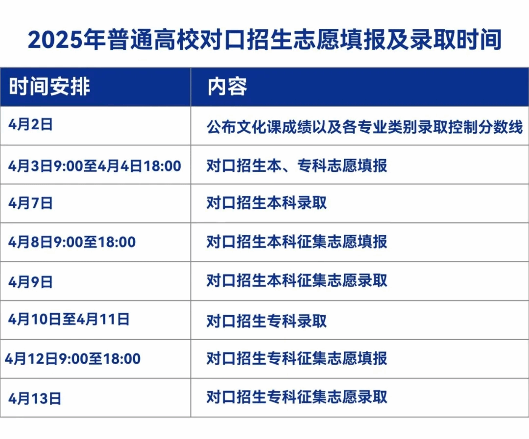 河南省对口招生考试4月2日开始查询成绩,请各位考生及家长关注。2025年普通高校对口招生志愿填报及录取时间安排如下: