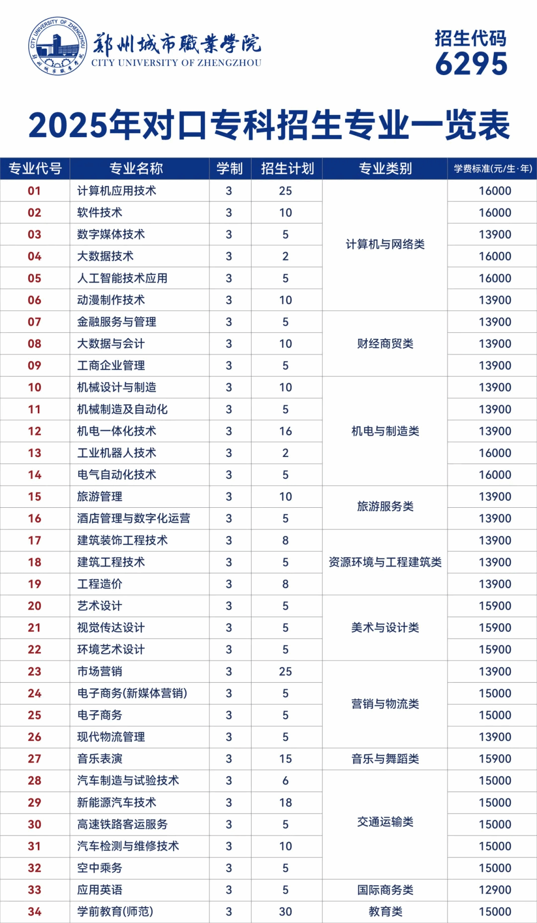 【权威发布】郑州城市职业学院2025年对口招生计划及专业代号