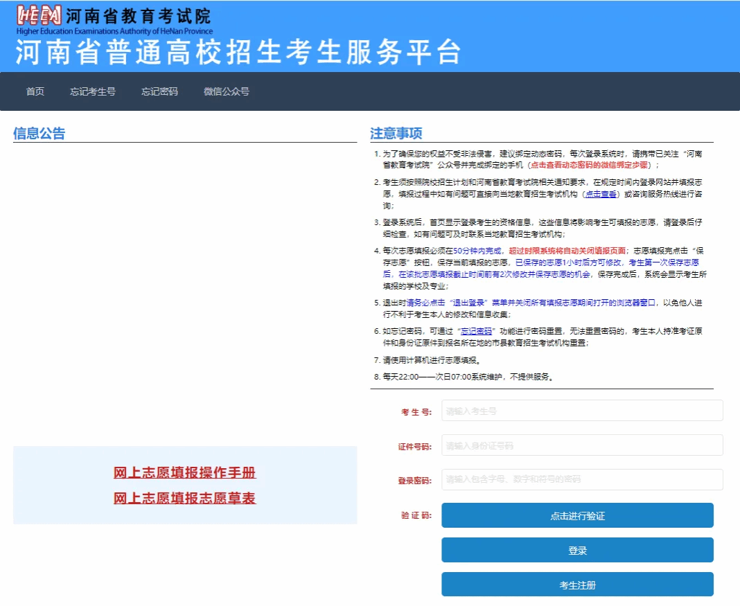进入考生服务平台后,请仔细阅读“信息公告”区、“注意事项”区发布的政策公告和注意事项。