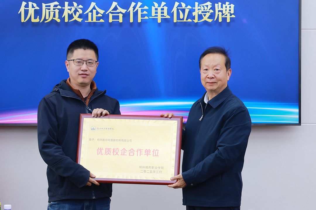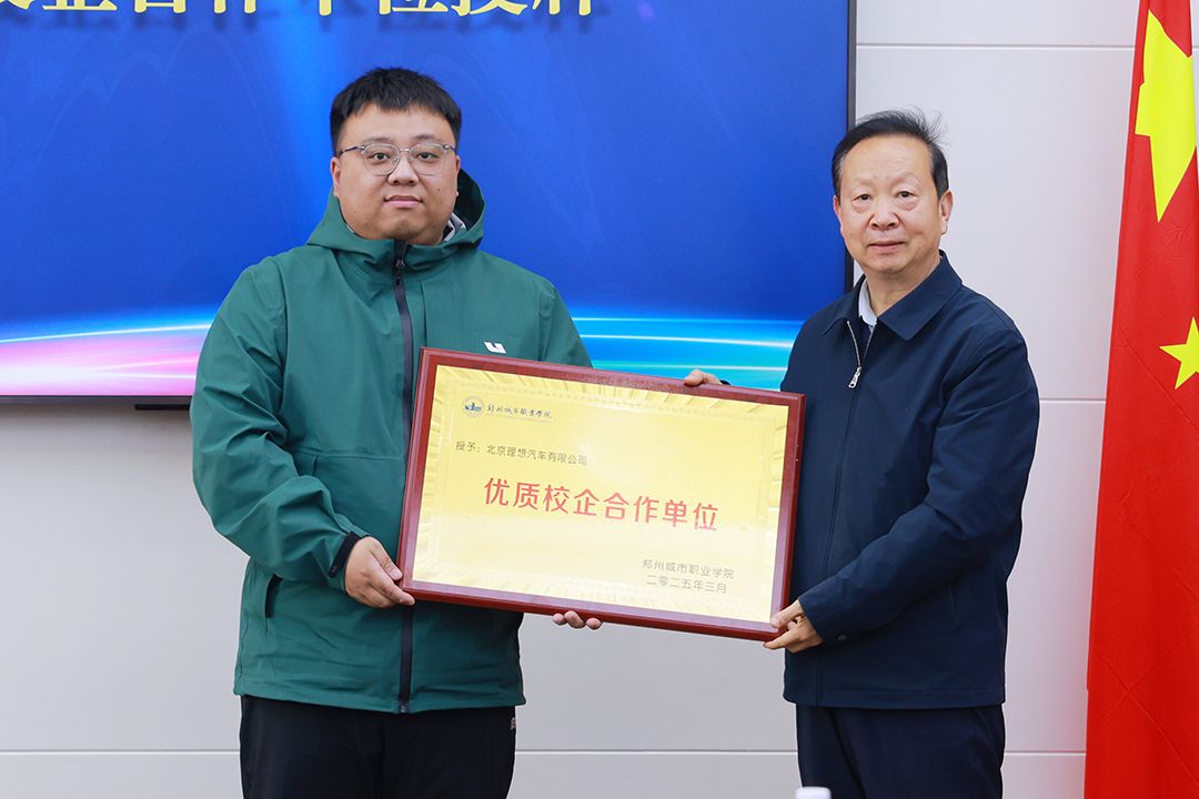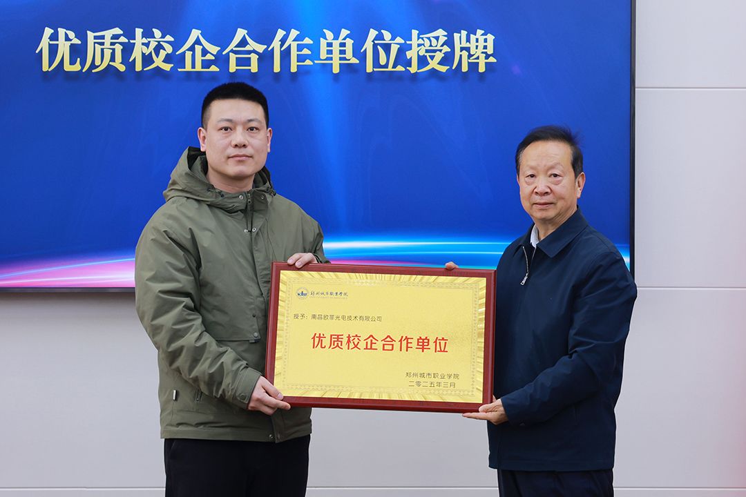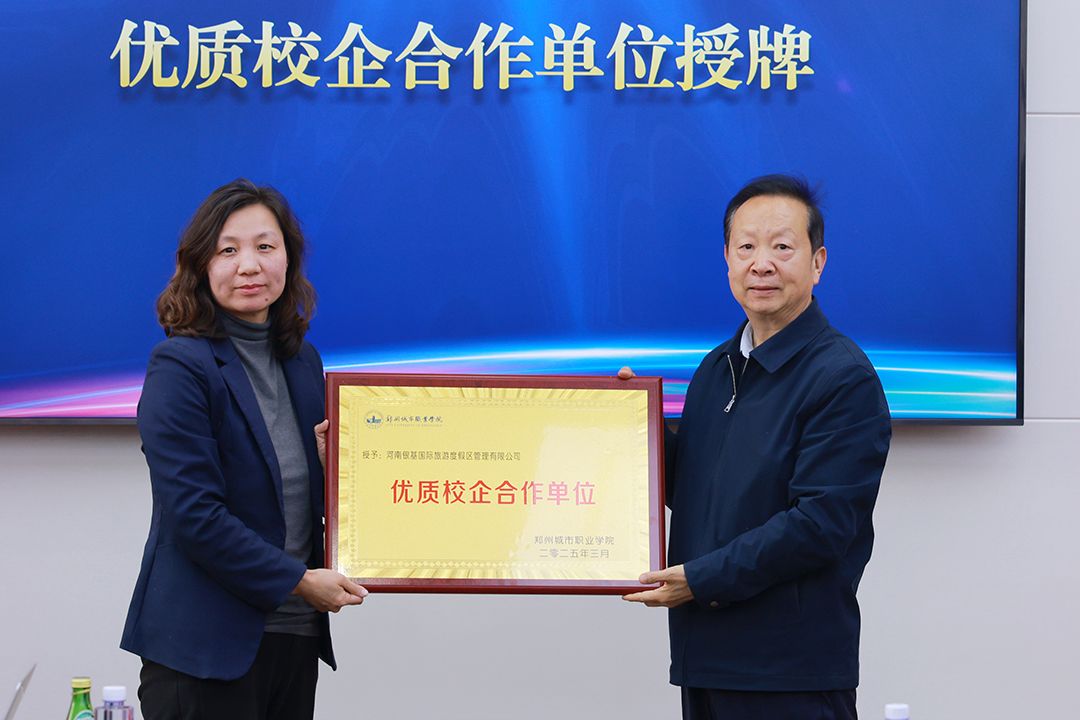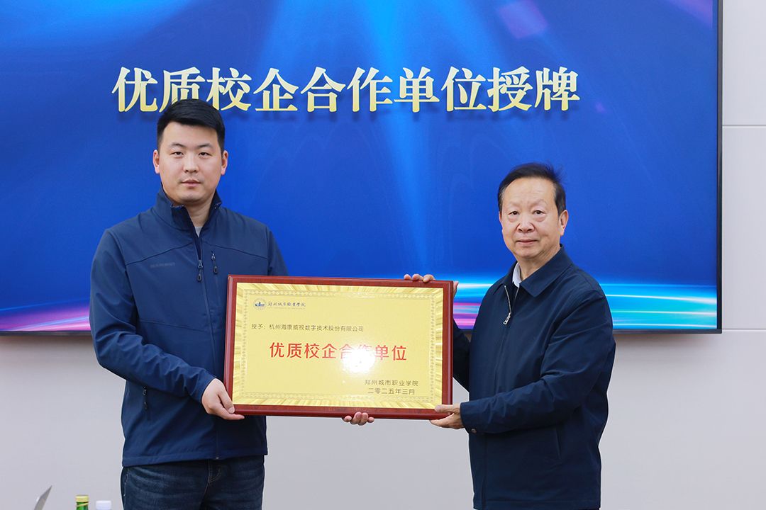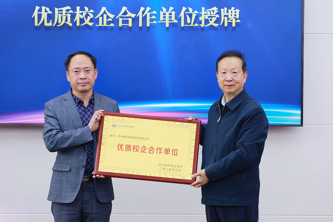 在政校企三方见证下,郑州城市职业学院与新合作企业格力电器、东方雨虹签署了校企合作协议书。同时为长期合作的郑州美的智慧家居有限公司、北京利尔高温材料股份有限公司、北京理想汽车有限公司、杭州海康威视数字技术股份有限公司、河南银基国际旅游度假区管理有限公司等10家企业授牌。